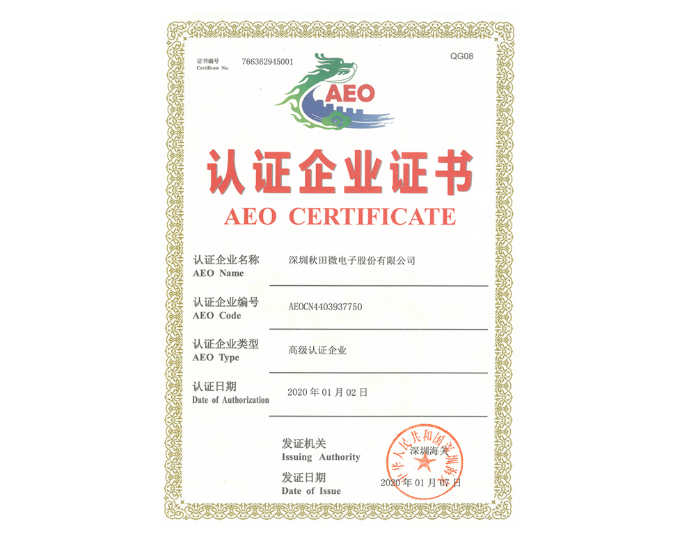 近日,深圳秋田微電子股份公司順利通過了海關AEO高級認證,獲得海關AEO高級認證企業(yè)證書,意味著公司在進出口業(yè)務流程管控、貿易安全、財務狀況等方面具有一定的管理優(yōu)勢,是對企業(yè)整體管理狀況的極大肯定。