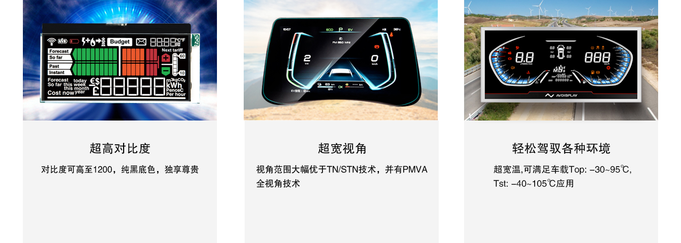 高對比度、寬廣視角、溫度適應(yīng)性好、純黑的底色。